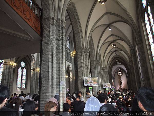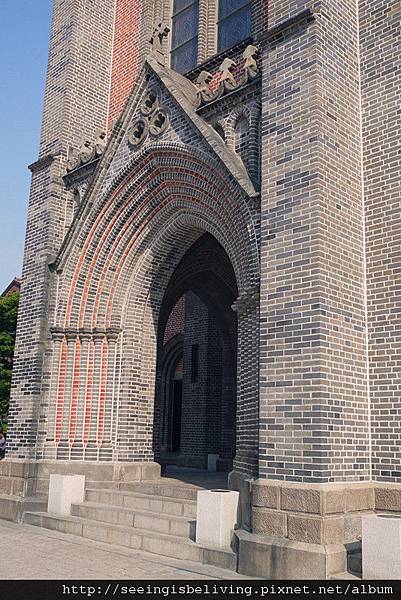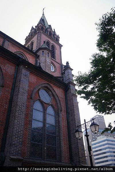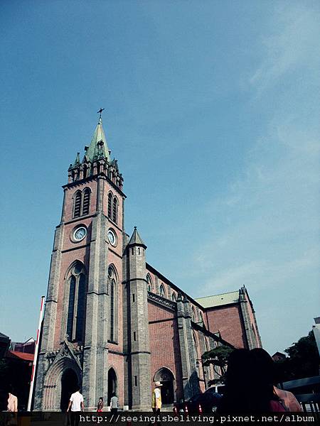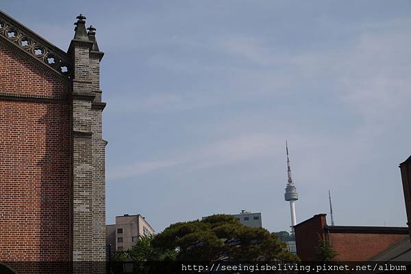 看到襯著藍天的教堂主建築後,覺得心境很平靜開闊,說話也輕柔了起來。絲毫無法與200公尺外明洞主街的喧鬧連在一起